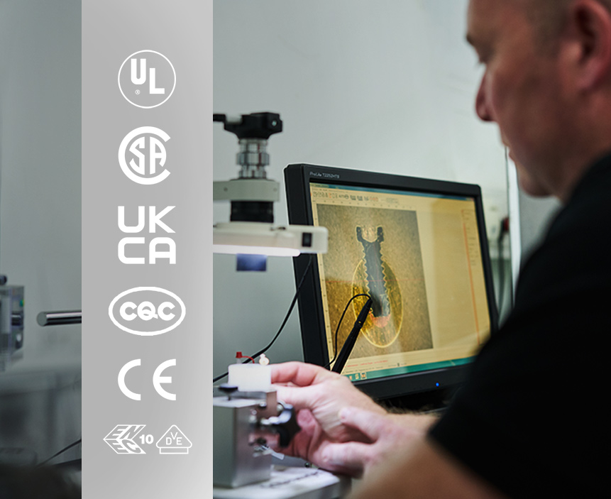 In unserem hauseigenen Prüflabor werden unsere Produkte auf Herz und Nieren getestet. Dazu zählen bspw. Temperatur- und Klimaprüfungen, Spritzwassertests und das Tauchbad, Schlagfestigkeitsprüfungen, Prüfung der mechanischen Belastbarkeit u.v.m. Dadurch gewährleisten wir, dass alle Produkte den normativen Vorgaben, wie z. B. der DIN 61439, der IEC 60309 usw., entsprechen. Auch führen wir den Großteil der Zertifizierungsprozesse unserer Produkte durch die einschlägigen Prüfinstitute, wie die des VDE, bei uns vor Ort durch.